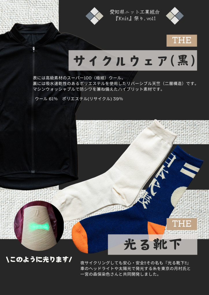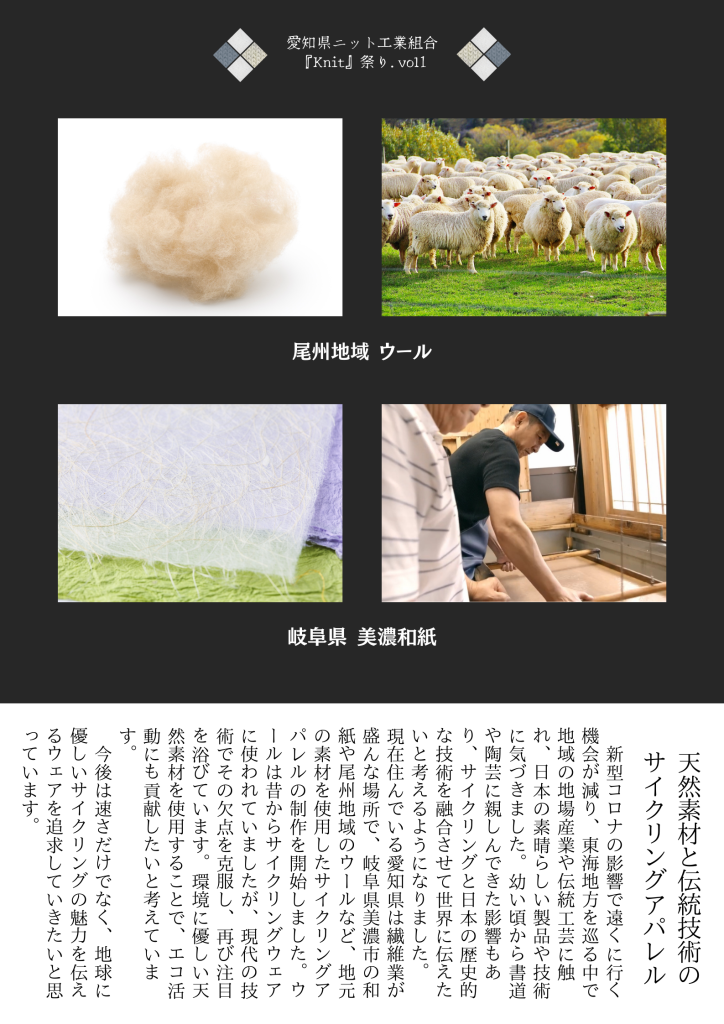 愛知県ニット工業組合の活動として、ロードサイクリングの別府匠 氏と共同で、普段使い出来る天然素材のサイクリングウェアの開発をおこなっています。