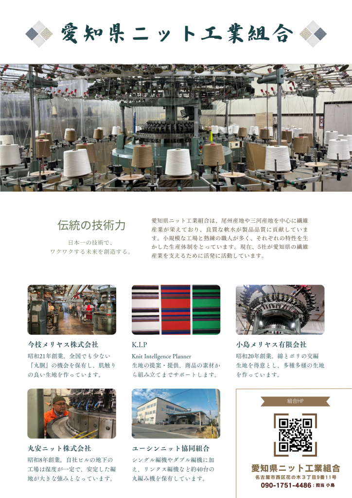 愛知県ニット工業組合は、尾州産地や三河産地を中心に繊維産業が栄えており、良質な軟水が製品品質に貢献しています。